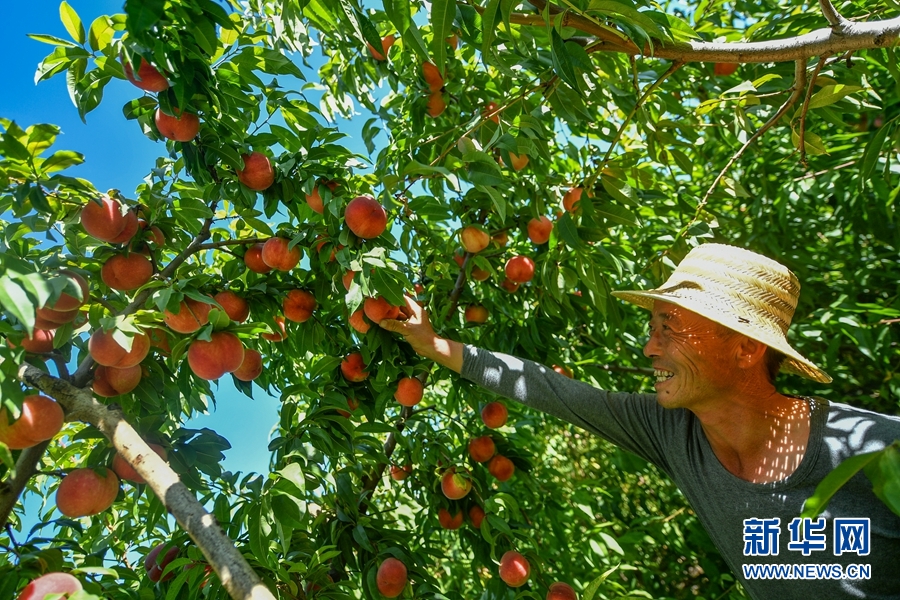 朱聯(lián)產(chǎn)在果園內(nèi)采摘桃子。新華網(wǎng) 潘彬彬 攝