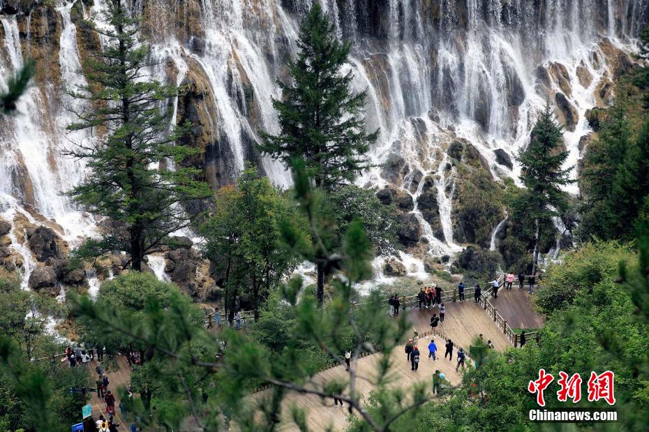 9月27日,四川阿壩,游客在九寨溝景區(qū)諾日朗瀑布前游覽。王磊 攝