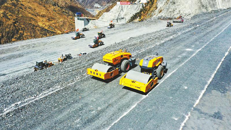 兩河口水電站大壩堆石區(qū)智能碾壓。(圖片由雅礱江流域水電開(kāi)發(fā)有限公司提供)