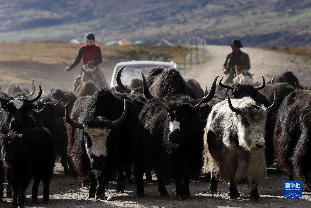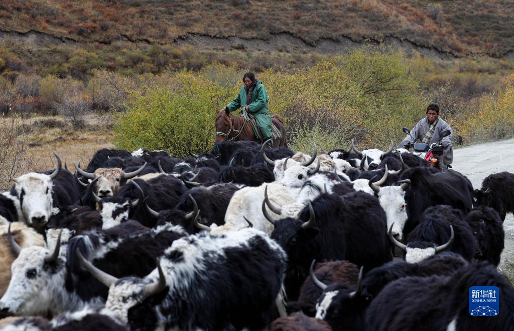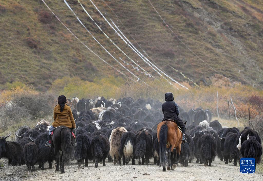 10月17日,四川省紅原縣阿木鄉(xiāng)卡口村藏牧民頓炯和向巴兩家的牛羊在冬季轉(zhuǎn)場(chǎng)的路上。新華社記者 江宏景 攝