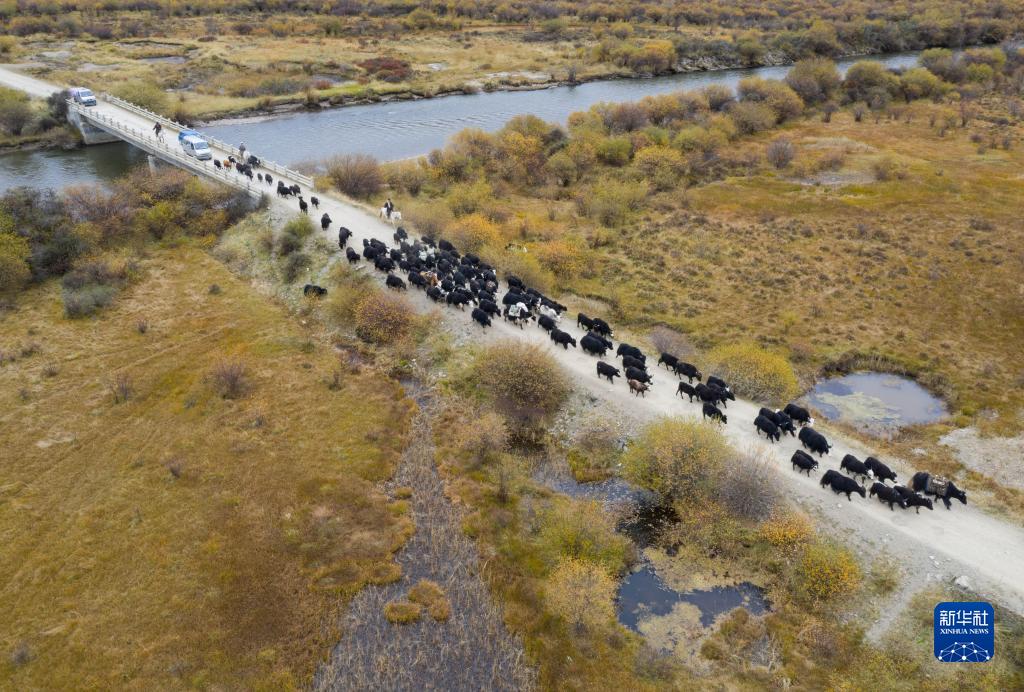 10月17日,四川省紅原縣阿木鄉(xiāng)卡口村藏牧民頓炯和向巴兩家的牛羊在冬季轉(zhuǎn)場(chǎng)的路上(無(wú)人機(jī)照片)。新華社記者 江宏景 攝