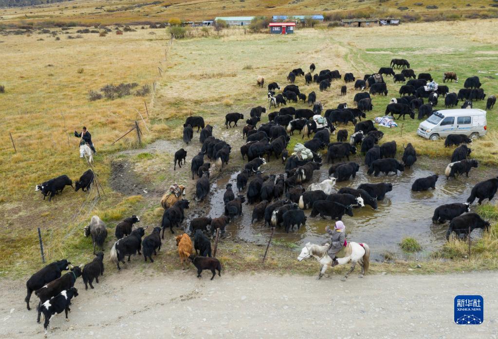 10月17日,經(jīng)過(guò)兩天爬涉,四川省紅原縣阿木鄉(xiāng)卡口村藏牧民頓炯和向巴兩家的牛羊回到冬牧場(chǎng)的草場(chǎng)上(無(wú)人機(jī)照片)。新華社記者 江宏景 攝