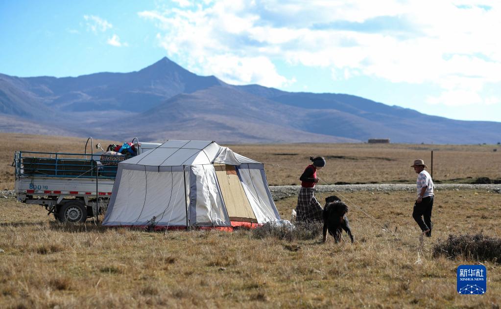 10月16日,四川省紅原縣阿木鄉(xiāng)卡口村藏牧民澤仁三周一家在冬季轉(zhuǎn)場(chǎng)的路上。因路程有70多公里,他們?cè)诎胪局兄饚づ裥菹⒁煌恚诙炖^續(xù)回遷。新華社記者 江宏景 攝