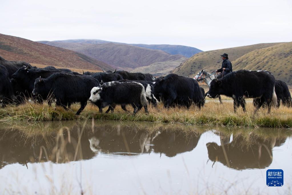 10月16日,四川省紅原縣阿木鄉(xiāng)卡口村藏牧民澤仁三周家的牛羊在冬季轉(zhuǎn)場(chǎng)的路上。新華社記者 江宏景 攝