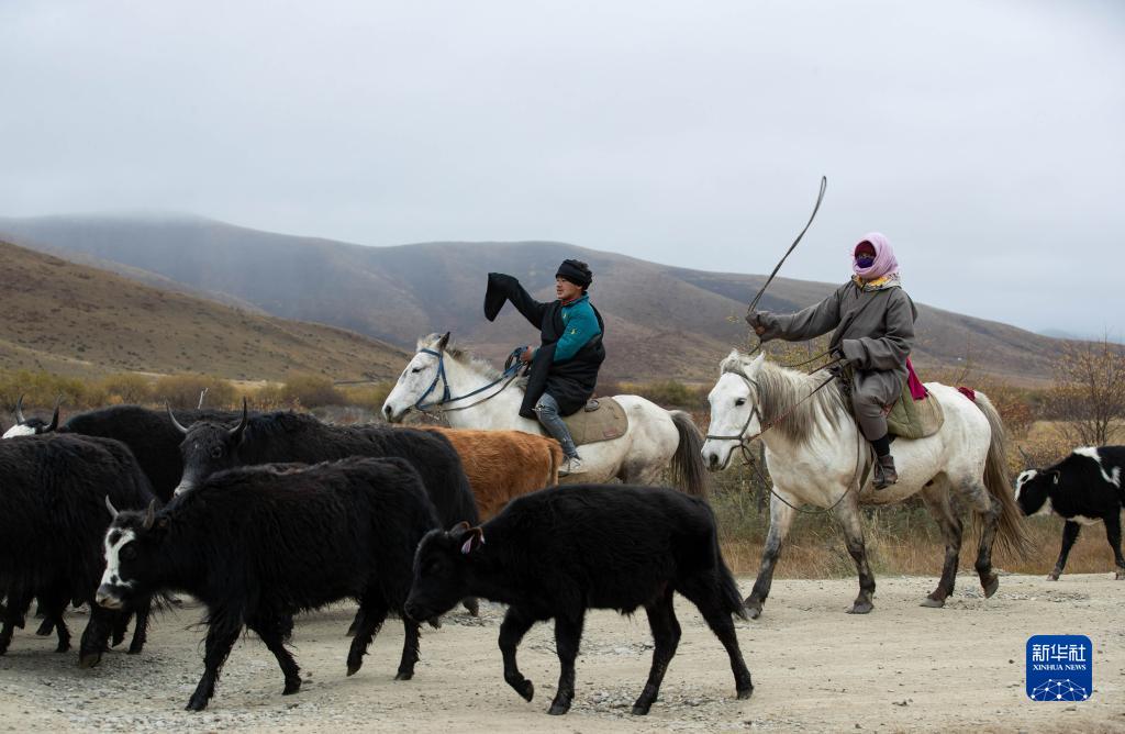 10月16日,四川省紅原縣阿木鄉(xiāng)卡口村藏牧民澤仁三周(右)和妻子騎著馬趕著牛羊在冬季轉(zhuǎn)場(chǎng)的路上。新華社記者 江宏景 攝