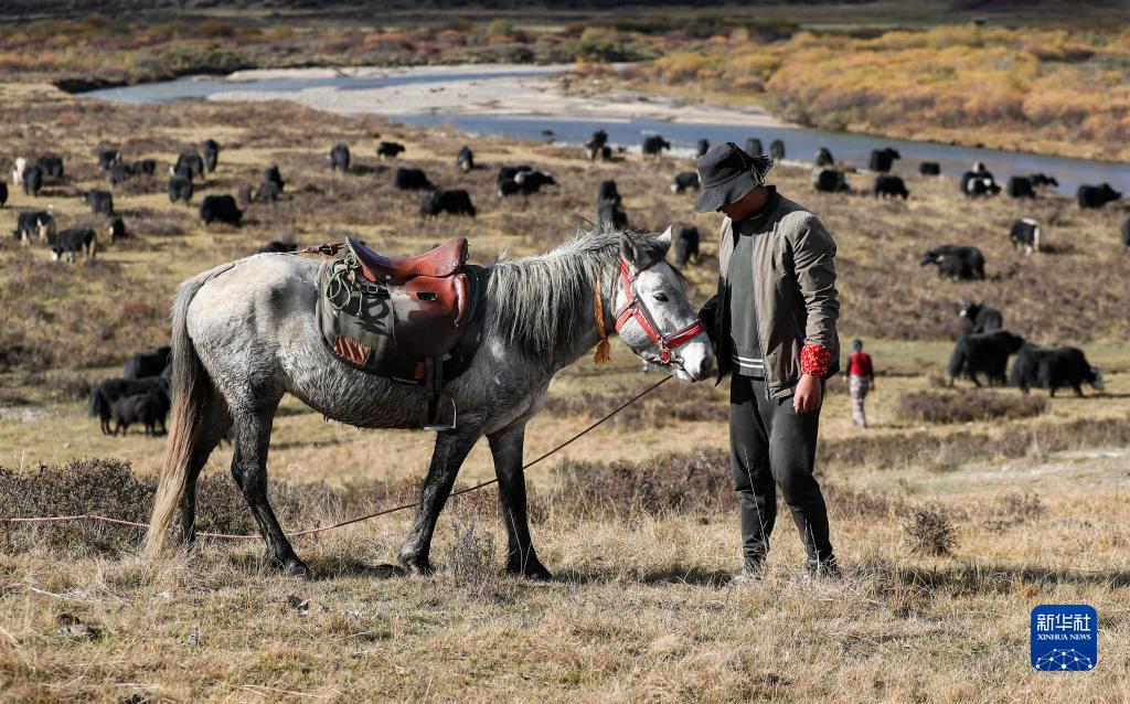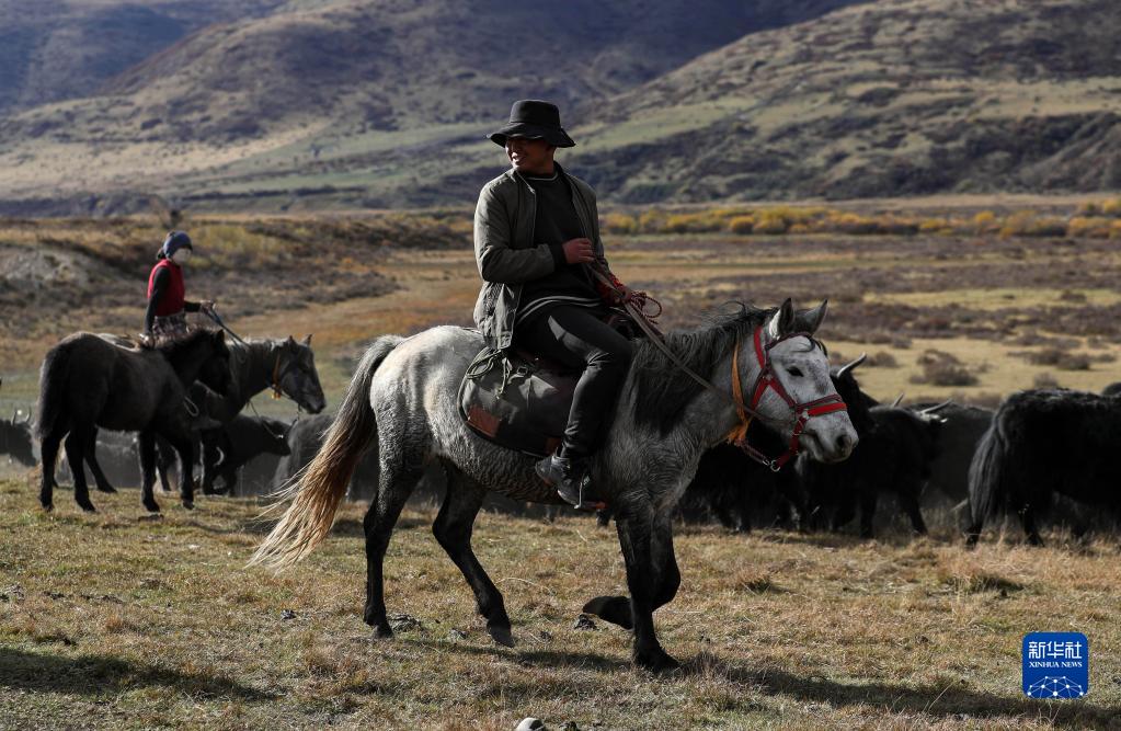 10月16日,四川省紅原縣阿木鄉(xiāng)卡口村藏牧民澤仁三周在冬季轉(zhuǎn)場(chǎng)的路上照看馬匹。新華社記者 江宏景 攝