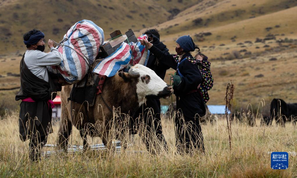 10月17日,經(jīng)過(guò)兩天跋涉,四川省紅原縣阿木鄉(xiāng)卡口村藏牧民頓炯和向巴兩家的牛羊回到冬牧場(chǎng)的草場(chǎng)上。頓炯(左一)從牦牛背上卸下家當(dāng)。新華社記者 江宏景 攝