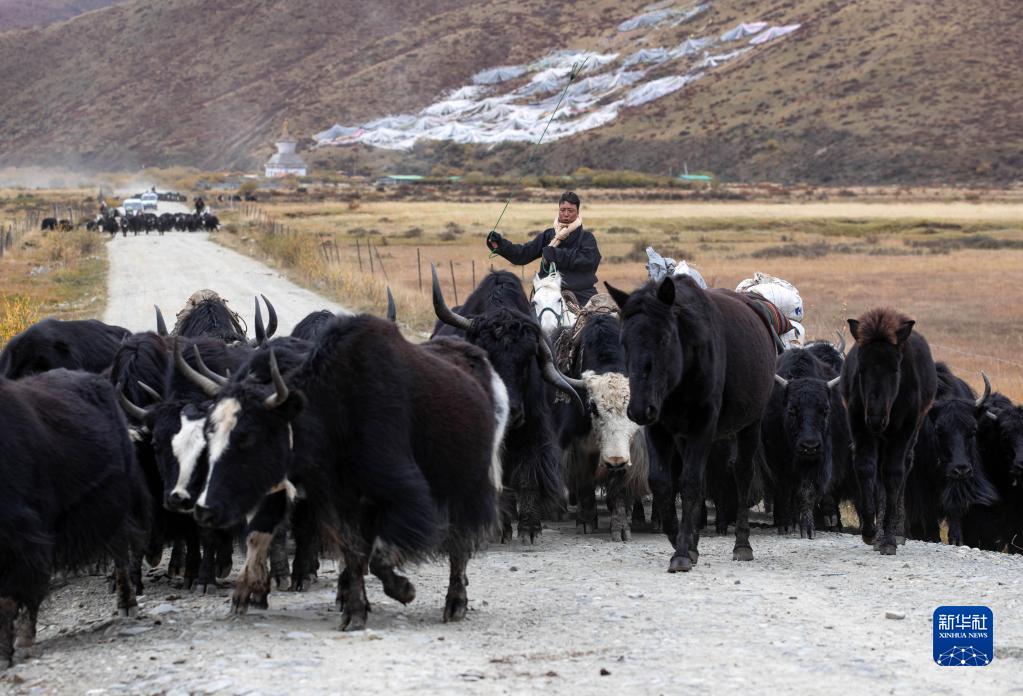 10月17日,四川省紅原縣阿木鄉(xiāng)卡口村藏牧民向巴(左)在冬季轉(zhuǎn)場(chǎng)的路上驅(qū)趕牦牛。新華社記者 江宏景 攝
