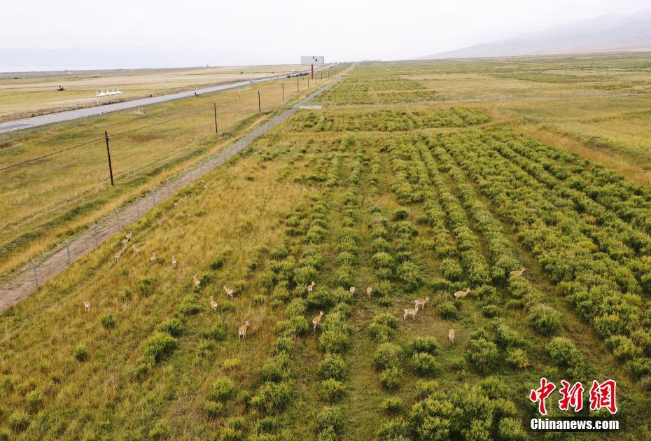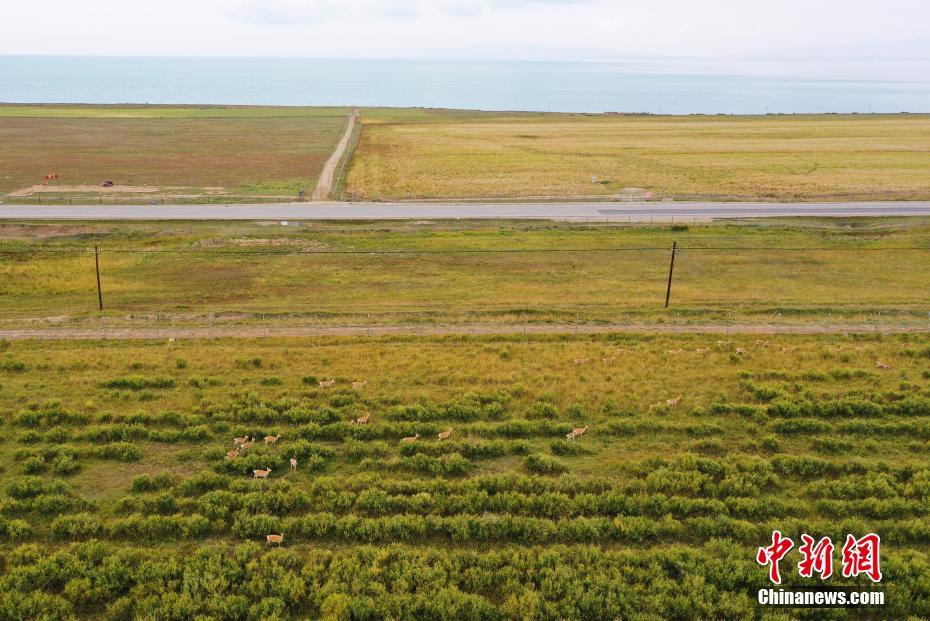 9月27日,在青海省海南藏族自治州共和縣青海湖國(guó)家級(jí)自然保護(hù)區(qū)南岸保護(hù)站,普氏原羚在草場(chǎng)內(nèi)進(jìn)食。(無(wú)人機(jī)照片) 中新社記者 馬銘言 攝