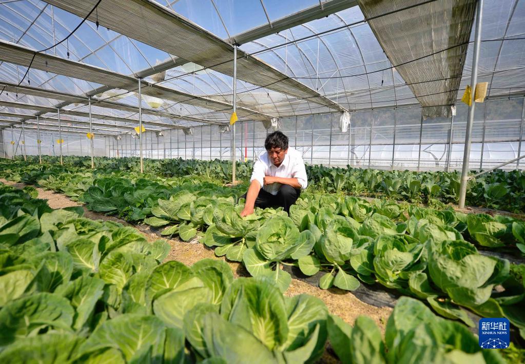 10月25日,村民在位于西地村的生態(tài)農(nóng)業(yè)示范基地內(nèi)查看蔬菜生長(zhǎng)情況。新華社記者 劉坤 攝