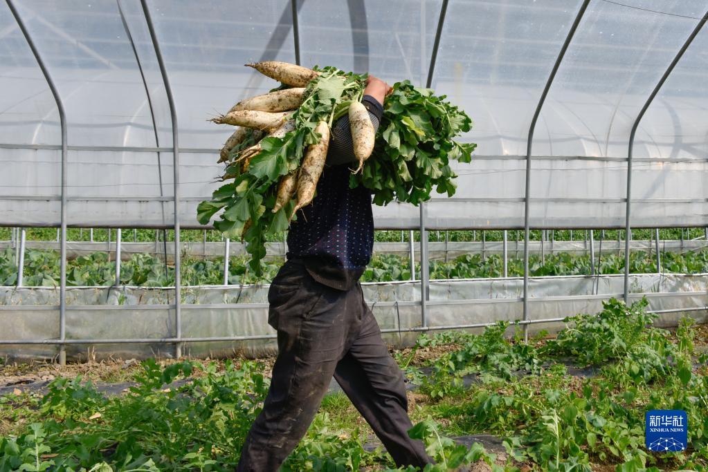 10月25日,村民在位于西地村的生態(tài)農(nóng)業(yè)示范基地內(nèi)搬運(yùn)蘿卜。新華社記者 劉坤 攝