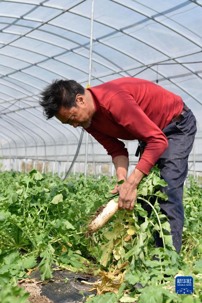 10月25日,村民在位于西地村的生態(tài)農(nóng)業(yè)示范基地內(nèi)拔蘿卜。新華社記者 胥冰潔 攝