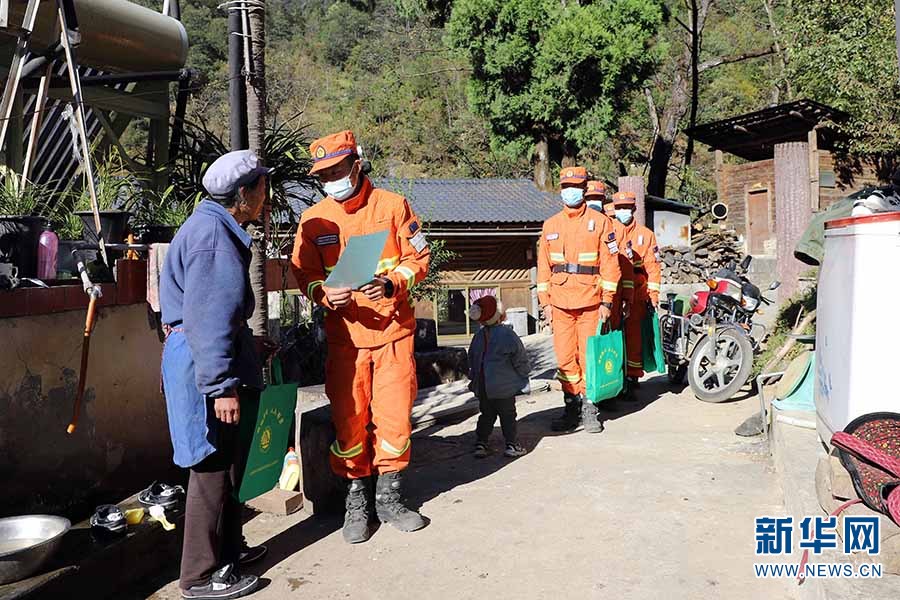森林消防員入戶發(fā)放防火宣傳單(攝于11月5日)。新華網(wǎng)發(fā)(云南省森林消防總隊(duì)迪慶大隊(duì)供圖)