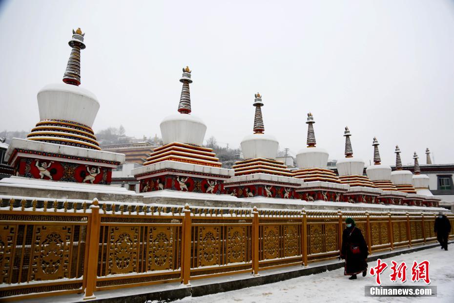 記者在塔爾寺內(nèi)看到,裹著藏袍的藏傳佛教信眾,扶老攜幼,在寺院山門(mén)處的標(biāo)志性建筑八寶如意塔周?chē)牡孛嫒紵?,并在高原冷風(fēng)中虔誠(chéng)守護(hù)。