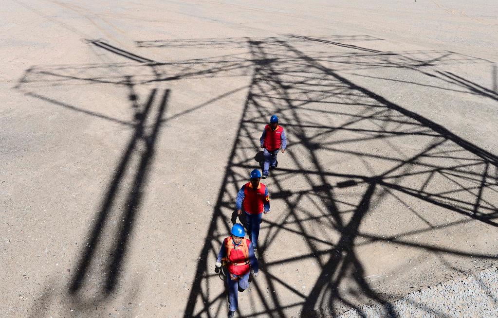 在青海格爾木,國網(wǎng)青海電力檢修公司工人徒步前往青藏聯(lián)網(wǎng)工程的輸電鐵塔。新華社記者張宏祥 攝