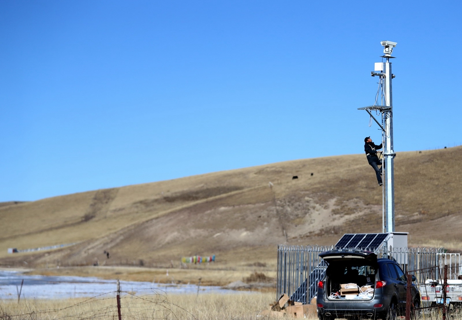 工作人員在尕海湖邊安裝遠(yuǎn)程視頻監(jiān)測(cè)監(jiān)控。