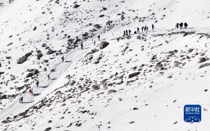 1月1日,登山愛好者攀登崗什卡雪峰(無人機(jī)照片)。