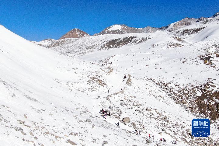 1月1日,登山愛好者攀登崗什卡雪峰(無人機(jī)照片)。新華社記者 張龍 攝