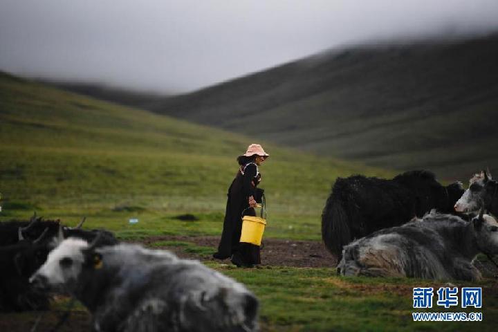 2021年8月3日,在果洛州瑪沁縣當(dāng)洛鄉(xiāng)貢龍村的夏季草場(chǎng)上,牧民準(zhǔn)備擠牛奶。新華社記者 張龍 攝