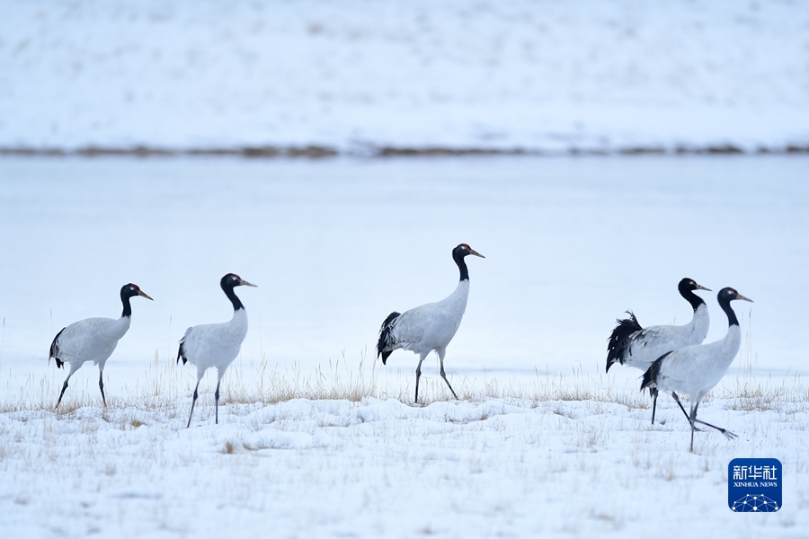 2021年10月21日在三江源國(guó)家公園黃河源園區(qū)內(nèi)拍攝的黑頸鶴。新華社記者 張龍 攝