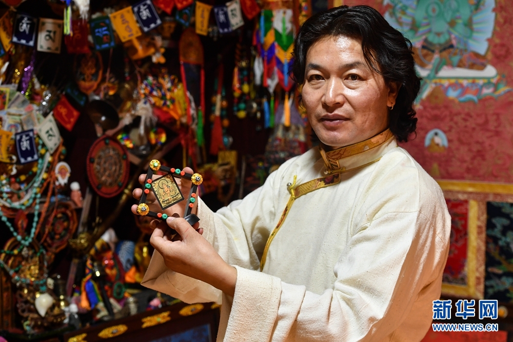 同仁市“脫貧攻堅(jiān)社會(huì)扶貧先進(jìn)個(gè)人”、黃南州“優(yōu)秀共產(chǎn)黨員”、青海省“綠色家庭示范戶”……近年來,格桑嘉措不僅通過自己的努力,帶動(dòng)當(dāng)?shù)刎毨艟偷貏?chuàng)業(yè),還積極投身各項(xiàng)公益活動(dòng)中,自2014年至今,已累計(jì)捐款捐物72萬元。圖為格桑嘉措在唐卡展廳內(nèi)整理他創(chuàng)作的文創(chuàng)產(chǎn)品。