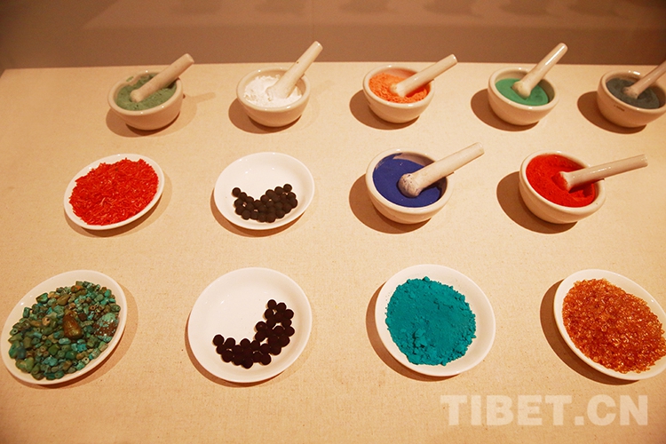 唐卡在顏料原料的選擇上,以礦物和植物為主,比如:金、銀、瑪瑙、孔雀石、青金石、朱砂等,以及藏紅花、大黃、藍(lán)靛等。天然的原料加之獨(dú)特的研制工藝,所繪制出的唐卡歷經(jīng)數(shù)百年,依然可以保持色澤艷麗。圖為唐卡顏料的原料 攝影:許娜