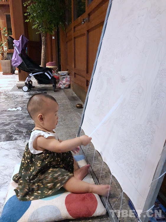 仁青多杰自己也有兩個(gè)女兒,大女兒已經(jīng)快五歲了,受家庭環(huán)境熏陶,從會(huì)走路時(shí)起,就喜歡拿毛筆,也非常喜歡畫畫。仁青多杰和父親每天都在畫畫,有一次在北京,仁青多杰的一幅唐卡快要完成了,女兒趁著中午大人們吃飯的間歇,跑出去拿著毛筆和顏料自己畫。那幅畫仁青多杰一直保留在北京,準(zhǔn)備等女兒長大后送給她。