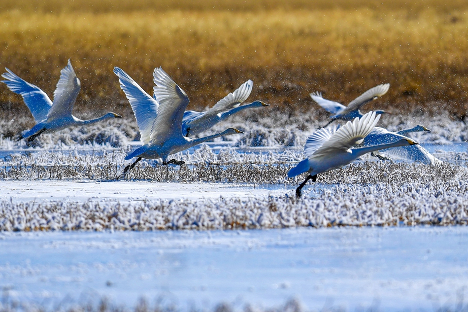 入冬以來(lái),甘肅省甘南藏族自治州碌曲縣尕海濕地越冬的大天鵝浴雪歡歌,翩翩起舞,成為草原上一道獨(dú)特的風(fēng)景。[詳細(xì)] -