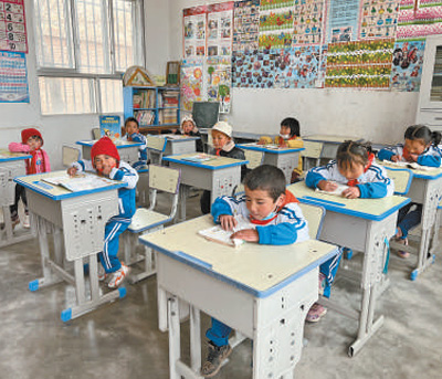 2017年,隨著易地扶貧搬遷政策的落實,越來越多村民選擇搬到山腳開始新的生活。學(xué)校里的孩子們由32名減少到9名。“9個孩子有7個是留守兒童,最大的8歲,最小的3歲?!蓖昝慈试霭押诎宸殖蓛蓧K,左邊是一年級,右邊是學(xué)前班,“安排了語文、數(shù)學(xué)、美術(shù)、道德與法治4門課,采用復(fù)式班的教學(xué)模式”。
