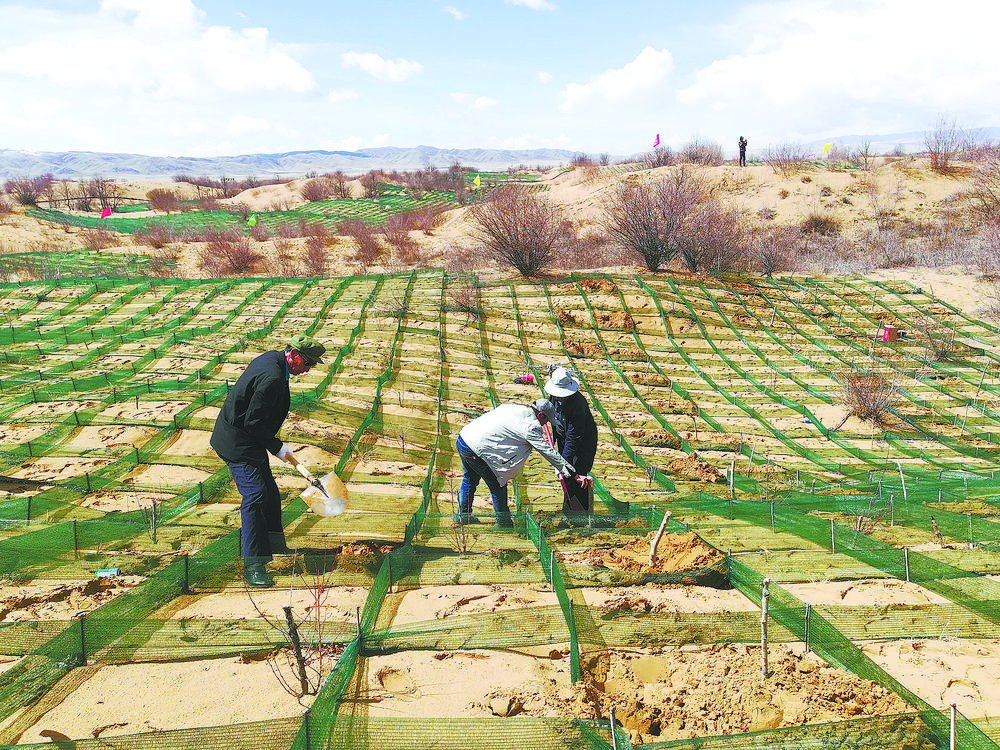 陶銳說:“比如在流動半流動沙丘,我們將工程固沙與生物治沙相結合。在迎風面設置1.5m×1.5m的草方格沙障,在設置好的草方格沙障內栽植青楊,進行烏柳插桿并點播檸條沙蒿等,而在背風坡實行插桿造林。在丘間地,我們則采取植苗造林,栽植烏柳苗和沙棘苗,并用網(wǎng)圍欄進行封育等?!?/p>