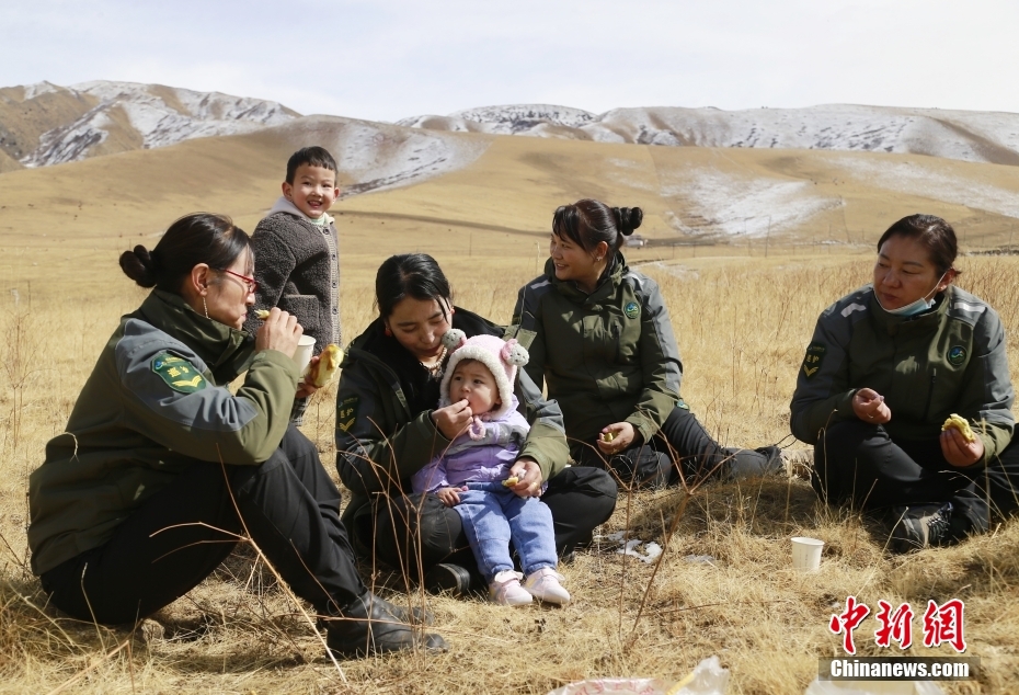 在巡護(hù)了一大片林地后,大家聚到一起休息。草原上席地而坐,背著只有11個(gè)月大的女兒的索南吉放下孩子,小扎西拿著風(fēng)鈴逗著妹妹。一壺清茶、一袋干糧、兩個(gè)孩子,一群女子交流著巡護(hù)情況,不時(shí)也會(huì)傳出開心的笑聲。