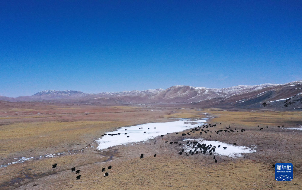 4月20日,在青海省玉樹藏族自治州曲麻萊縣,牦牛在草原上覓食(無人機照片)。新華社記者 柳澤興 攝