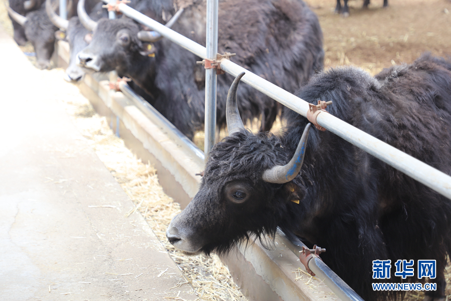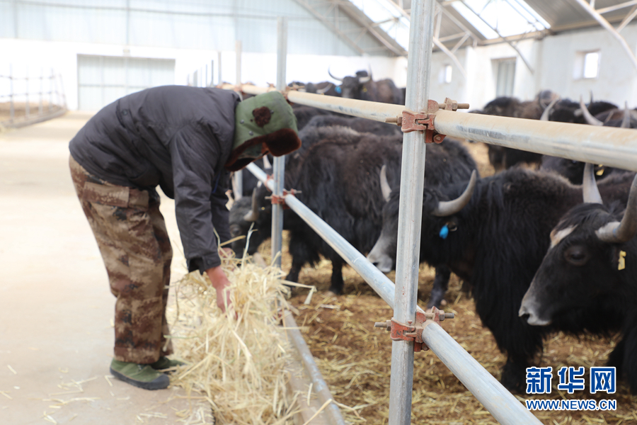 在天峻縣陽康鄉(xiāng)牦牛核心群培育基地內(nèi),工作人員在給牦牛投放飼草。新華網(wǎng) 吳婷婷 攝