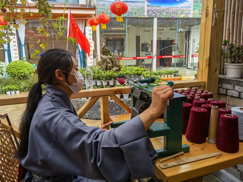 2022年5月12日,“5·12”汶川特大地震抗震救災(zāi)14周年紀(jì)念日,山鷹帶著幾個(gè)員工來到漁子溪,在汶川縣黨委、映秀鎮(zhèn)黨委、漁子溪村兩委及當(dāng)?shù)厝罕姷臒崆閹椭?,舉辦了“藍(lán)措馬”品牌圍巾展示活動(dòng)。村里還積極幫助他們尋找合適的房屋作為編織車間,讓他們先在漁子溪站住腳。
