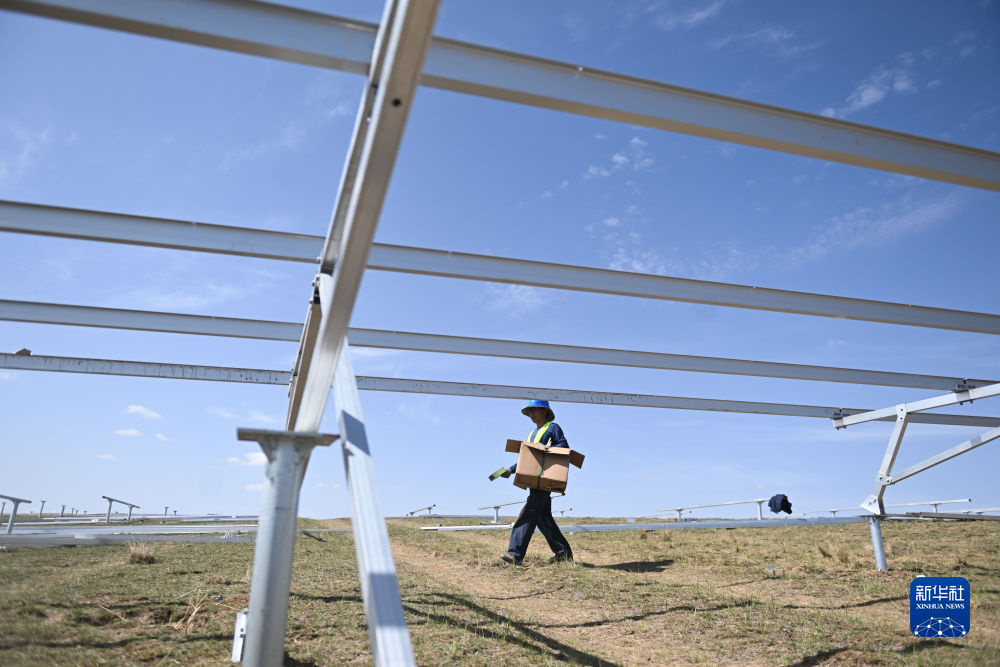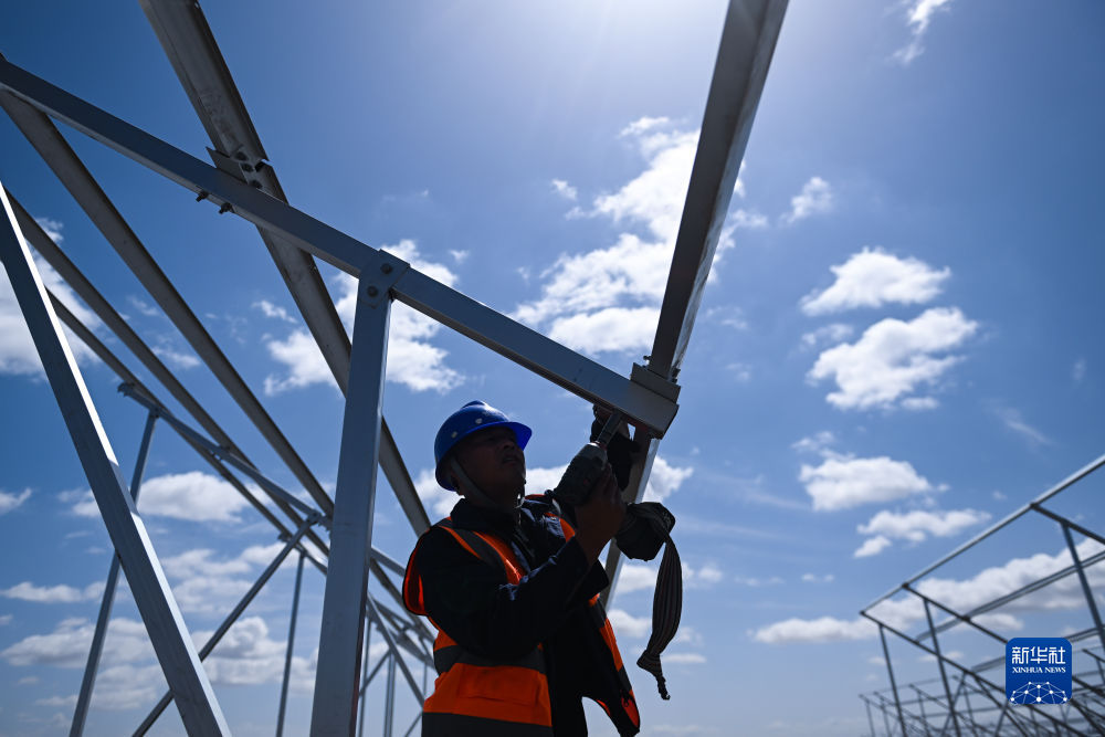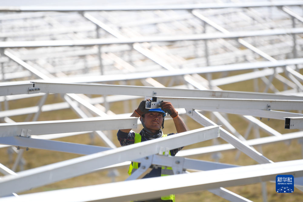 6月8日,工人在黃河上游水電開發(fā)有限責任公司海南基地共和縣100萬千瓦光伏項目現(xiàn)場施工。新華社記者 駱曉飛 攝