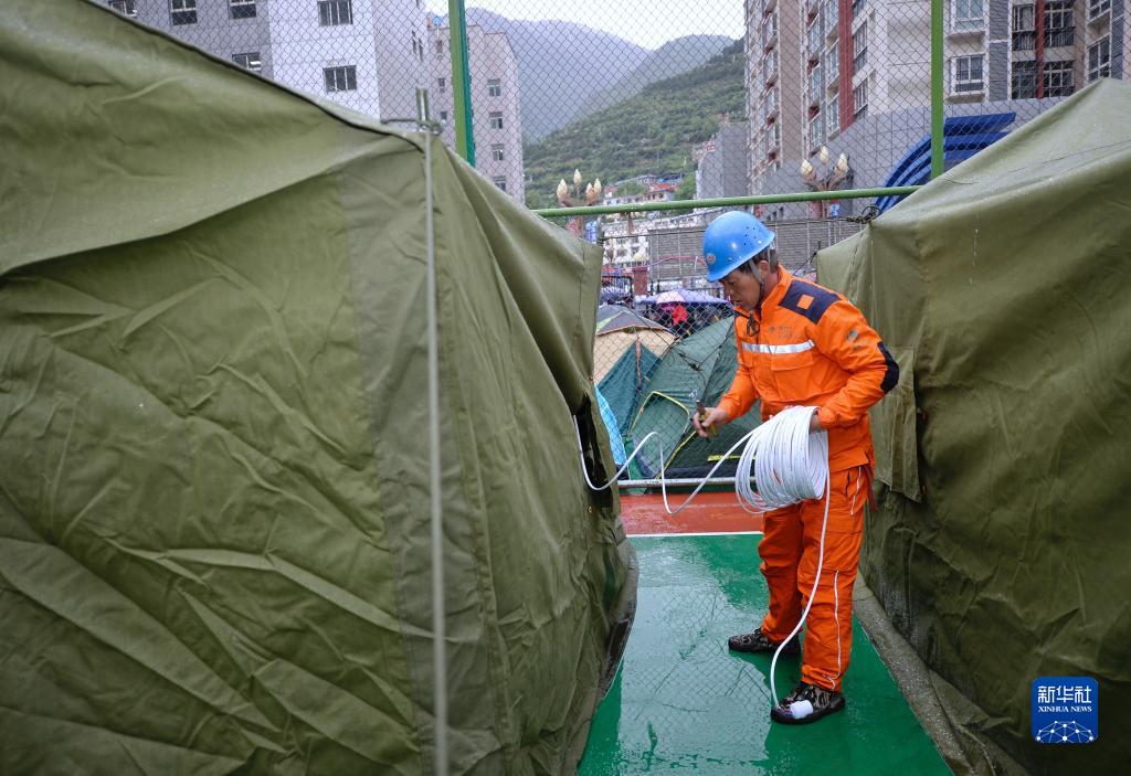 6月10日,在馬爾康市州醫(yī)院背后廣場安置點內(nèi),武警阿壩支隊隊員在搭建帳篷。新華社記者 劉坤 攝