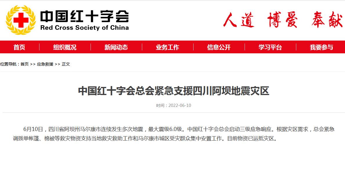 據(jù)中國(guó)紅十字會(huì)網(wǎng)站10日消息,6月10日,四川省阿壩州馬爾康市連續(xù)發(fā)生多次地震,最大震級(jí)6.0級(jí)。中國(guó)紅十字會(huì)總會(huì)啟動(dòng)三級(jí)應(yīng)急響應(yīng)。根據(jù)災(zāi)區(qū)需求,總會(huì)緊急調(diào)撥單帳篷、棉被等救災(zāi)物資支持當(dāng)?shù)鼐葹?zāi)救助工作和馬爾康市城區(qū)受災(zāi)群眾集中安置工作。目前物資已運(yùn)抵災(zāi)區(qū)。