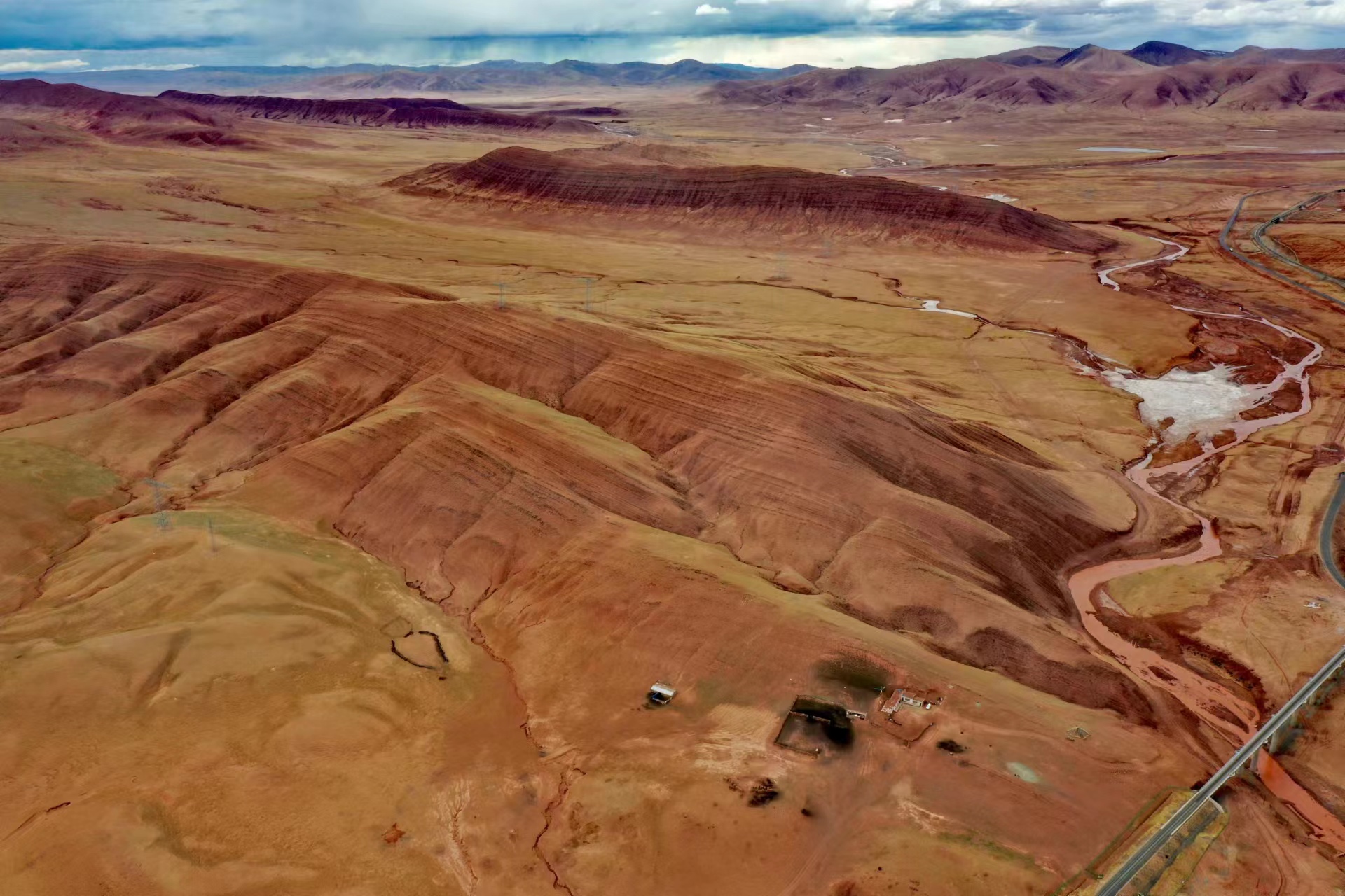 近日,中國地質(zhì)大學(xué)(武漢)長江科考先遣隊員張永一行進(jìn)行綜合科學(xué)考察時,在青藏公路日阿尺曲一帶發(fā)現(xiàn)一條紅色山脈,是青藏高原109國道沿線一處壯觀的地質(zhì)遺跡。該山脈由晚白堊紀(jì)鈣質(zhì)膠結(jié)的粉、細(xì)砂巖與古近紀(jì)紫紅色、磚紅色復(fù)成份礫巖所組成,呈近東西走向,兩坡不對稱,南陡北緩,地層剖面出露清楚。
