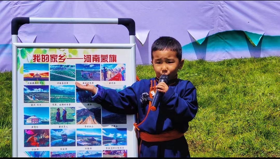 “我的家鄉(xiāng)在中國西部,這里有一片非常美麗的大草原,大家都喜歡叫她‘河南蒙旗’,這里有藍天、白云、草原、牛羊、湖泊、河流……”來自青海省黃南藏族自治州河南蒙古族自治縣中心幼兒園五歲半的觀卻東珠作為“講解員”,正聲情并茂的向老師、同學以及家長介紹自己的家鄉(xiāng)。