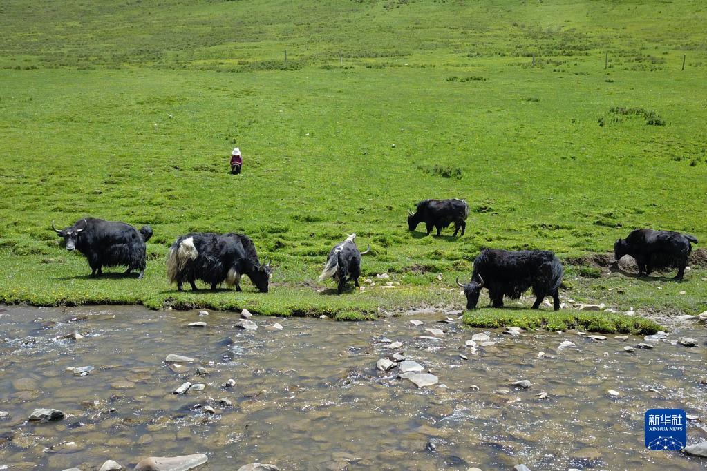 這是7月4日在稱多縣歇武鎮(zhèn)牧業(yè)村拍攝的牦牛養(yǎng)殖基地一角(無人機照片)。新華社記者 范培珅 攝