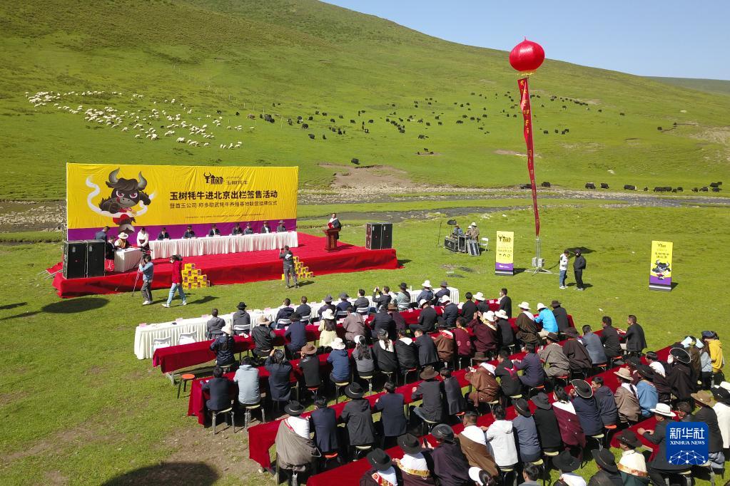 這是7月5日在稱多縣歇武鎮(zhèn)牧業(yè)村拍攝的玉樹牦牛進北京出欄簽售活動現(xiàn)場(無人機照片)。新華社記者 范培珅 攝