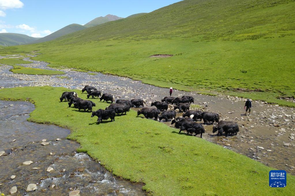 在稱多縣歇武鎮(zhèn)牧業(yè)村的牦牛養(yǎng)殖基地,一群牦牛奔去河中飲水(7月4日攝)。新華社記者 范培珅 攝