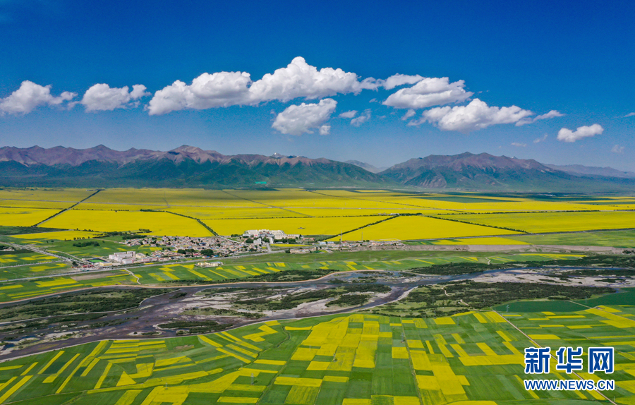 金黃色的油菜花在藍(lán)天白云映襯下,宛如一幅壯麗畫卷。新華網(wǎng) 宋忠勇 攝