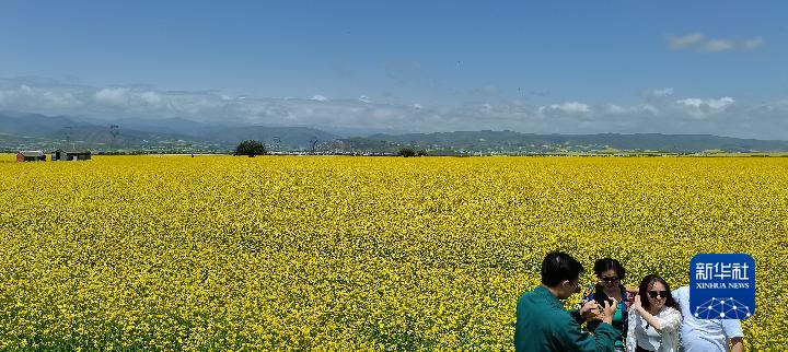 盛夏時(shí)節(jié),從青海省會(huì)西寧出發(fā),沿張汶高速公路驅(qū)車1個(gè)多小時(shí),就進(jìn)入門源回族自治縣境內(nèi)。油菜花鋪展出“金色花?!保斓亻g融為一幅濃墨重彩的天然畫卷。