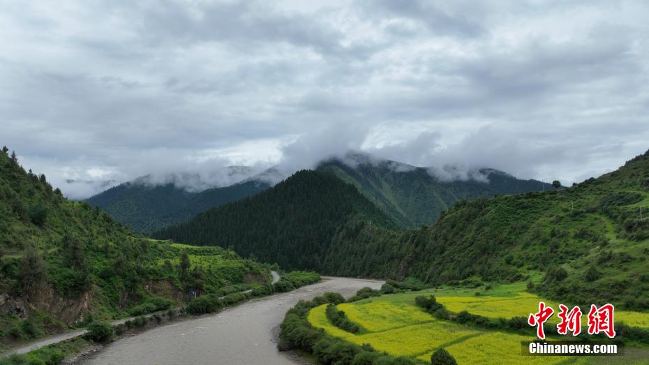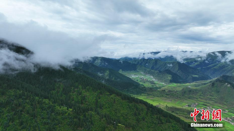 7月11日,一場(chǎng)降雨過后,云霧如潔白的哈達(dá)飄落在青海省果洛藏族自治州班瑪縣瑪可河國(guó)家森林公園山頭,與樹木、河流、梯田相互映襯,自然風(fēng)景美如畫。