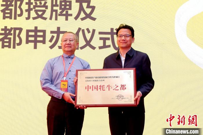 圖為中國(guó)肉類(lèi)協(xié)會(huì)副會(huì)長(zhǎng)高觀(左)為玉樹(shù)州授予“中國(guó)牦牛之都”稱(chēng)號(hào)。李雋 攝