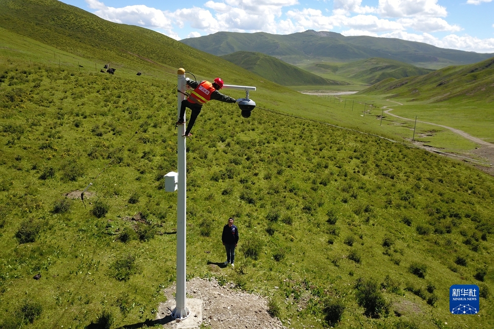 7月22日,在甘德縣生態(tài)畜牧業(yè)聯(lián)合社牦牛養(yǎng)殖基地,技術(shù)人員維護視頻監(jiān)控設(shè)備(無人機照片)。新華社記者 范培珅 攝