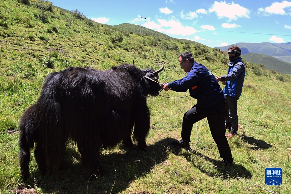 7月22日,在甘德縣生態(tài)畜牧業(yè)聯(lián)合社牦牛養(yǎng)殖基地,技術(shù)人員給牦牛佩戴智能項圈。新華社記者 范培珅 攝