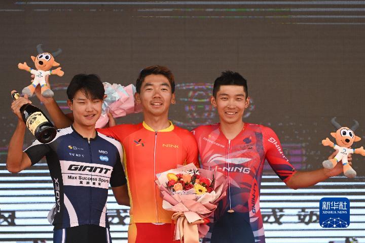 7月31日,獲得當日賽段前三的甘肅體彩隊選手彭鑫(中)、捷安特洲際隊選手吳俊杰(左)、李寧之星洲際隊選手牛益逵在領獎臺上合影。新華社記者 張龍 攝