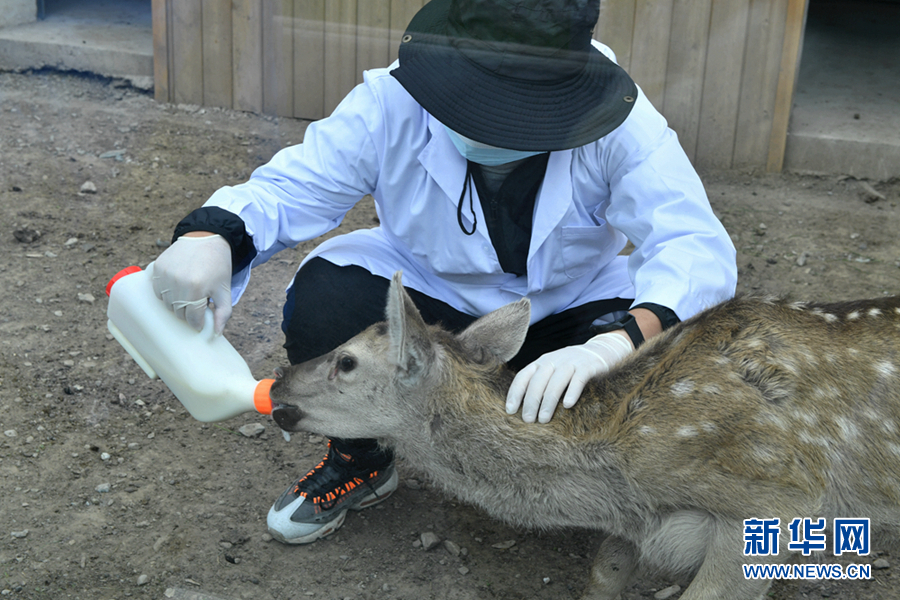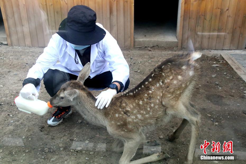 在祁連山國家公園青海片區(qū)野生動(dòng)物救護(hù)繁育中心內(nèi),工作人員正在給馬鹿喂奶。新華網(wǎng) 卡婭梅朵 攝